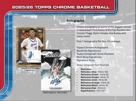 Topps Chrome Basketball is back in 2026! Find and collect a 299 card Base set featuring some of the top Rookie, Vets and Retired players in Basketball!