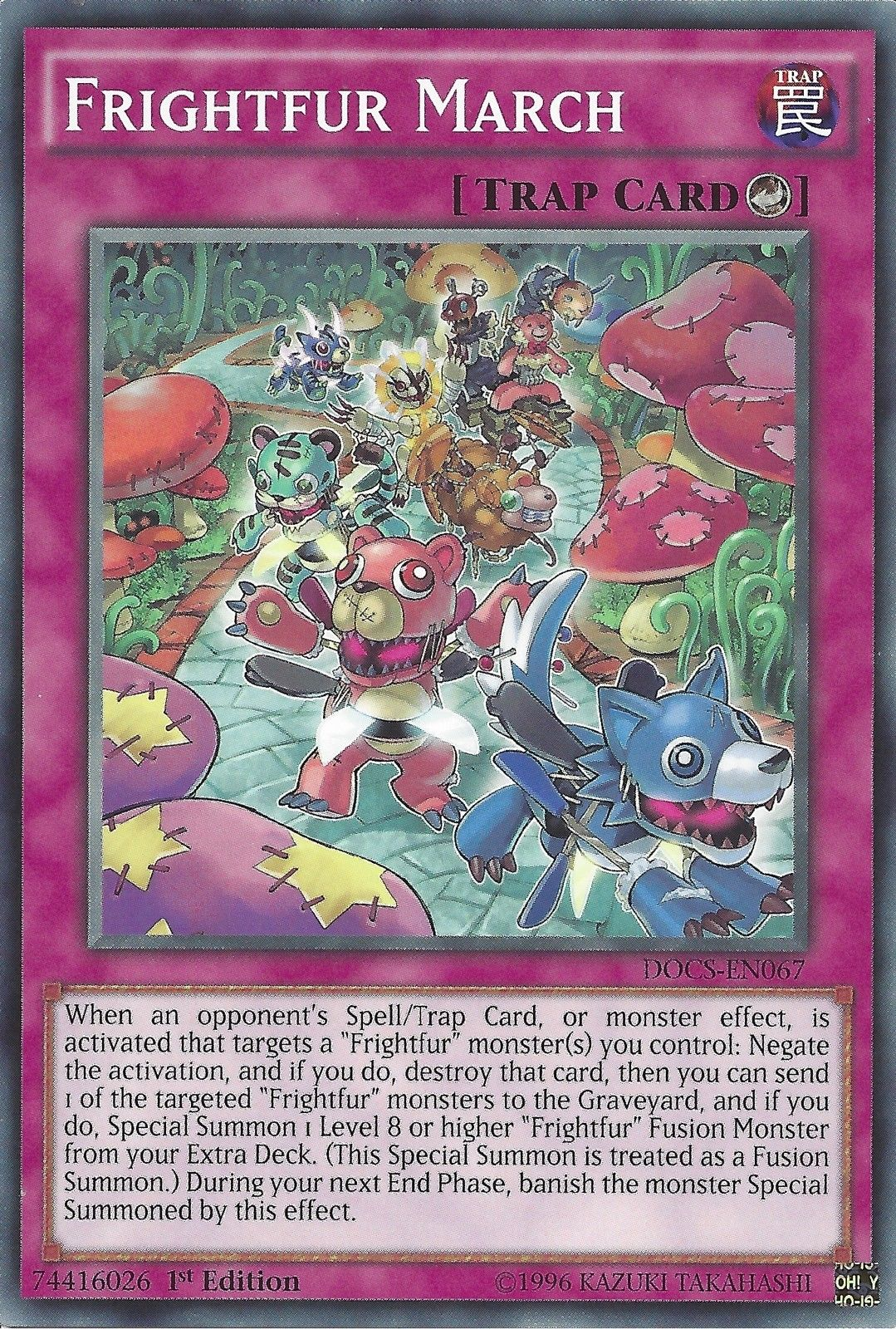 When an opponent's Spell/Trap card, or monster effect is activated that targets a "Frightfur": monster(s) you control: Negate the activation, and if you do, destroy that card, then you can send 1 of the targeted "Frightfur" monsters to the Graveyard, and if you do, Special Summon 1 Level 8 or higher "Frightfur" Fusion Monster from your Extra Deck. (This Special Summon is treated as a Fusion Summon.) During your next End Phase, banish the monster Special Summoned by this effect.