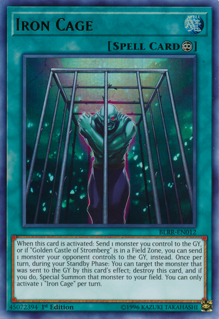When this card is activated: Send 1 monster you control to the GY, or, if "Golden Castle of Stromberg" is in the Field Zone, you can send 1 monster your opponent controls to the GY, instead. Once per turn, during your Standby Phase: You can target 1 monster in the GY that was sent there by this card's effect; destroy this card, and if you do, Special Summon that monster to your field. You can only activate 1 "Iron Cage" per turn.