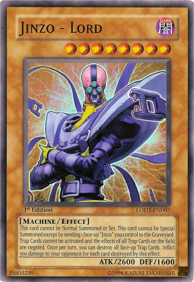 This card cannot be Normal Summoned or Set. This card cannot be Special Summoned except by sending 1 face-up "Jinzo" you control to the Graveyard. Trap Cards cannot be activated and the effects of all Trap Cards on the field are negated. Once per turn, you can destroy all face-up Trap Cards. Inflict 300 damage to your opponent for each card destroyed by this effect.