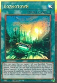 Once per turn: You can target 1 of your banished "Kozmo" monsters; return it to the hand, and if you do, lose LP equal to its original Level x 100. Once per turn: You can reveal any number of "Kozmo" monsters in your hand and shuffle them into the Deck, then draw cards equal to the number of cards you shuffled into the Deck. If this card in the Field Zone is destroyed by a card effect: You can add 1 "Kozmo" card from your Deck to your hand.