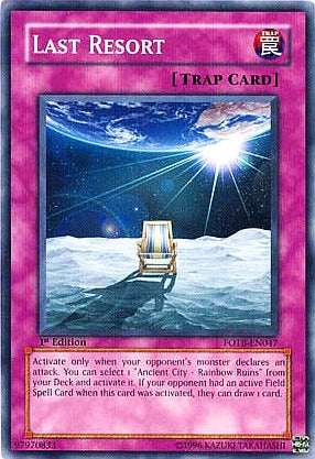 Activate only when your opponent's monster declares an attack. You can select 1 "Ancient City - Rainbow Ruins" from your Deck and activate it. If your opponent had an active Field Spell Card when this card was activated, they can draw 1 card.