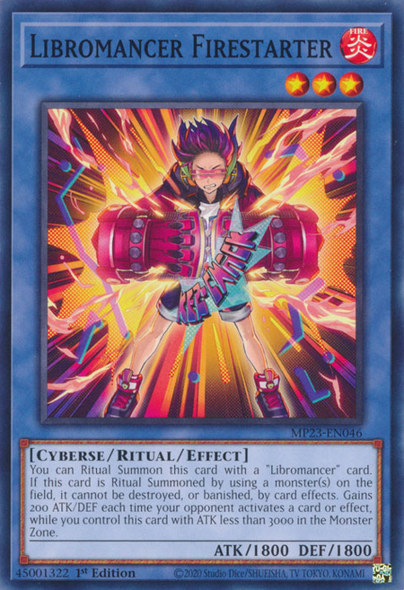 You can Ritual Summon this card with a "Libromancer" card. If this card is Ritual Summoned by using a monster(s) on the field, it cannot be destroyed, or banished, by card effects. Gains 200 ATK/DEF each time your opponent activates a card or effect, while you control this card with ATK less than 3000 in the Monster Zone.