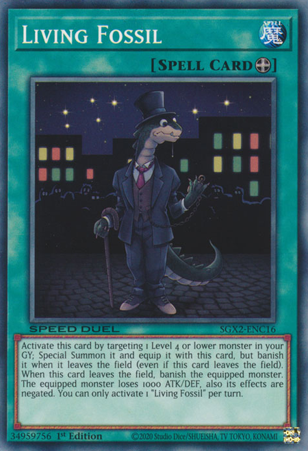 Activate this card by targeting 1 Level 4 or lower monster in your GY; Special Summon it and equip it with this card, but banish it when it leaves the field (even if this card has left the field). When this card leaves the field, banish the equipped monster. The equipped monster loses 1000 ATK/DEF, also its effects are negated. You can only activate 1 "Living Fossil" per turn.