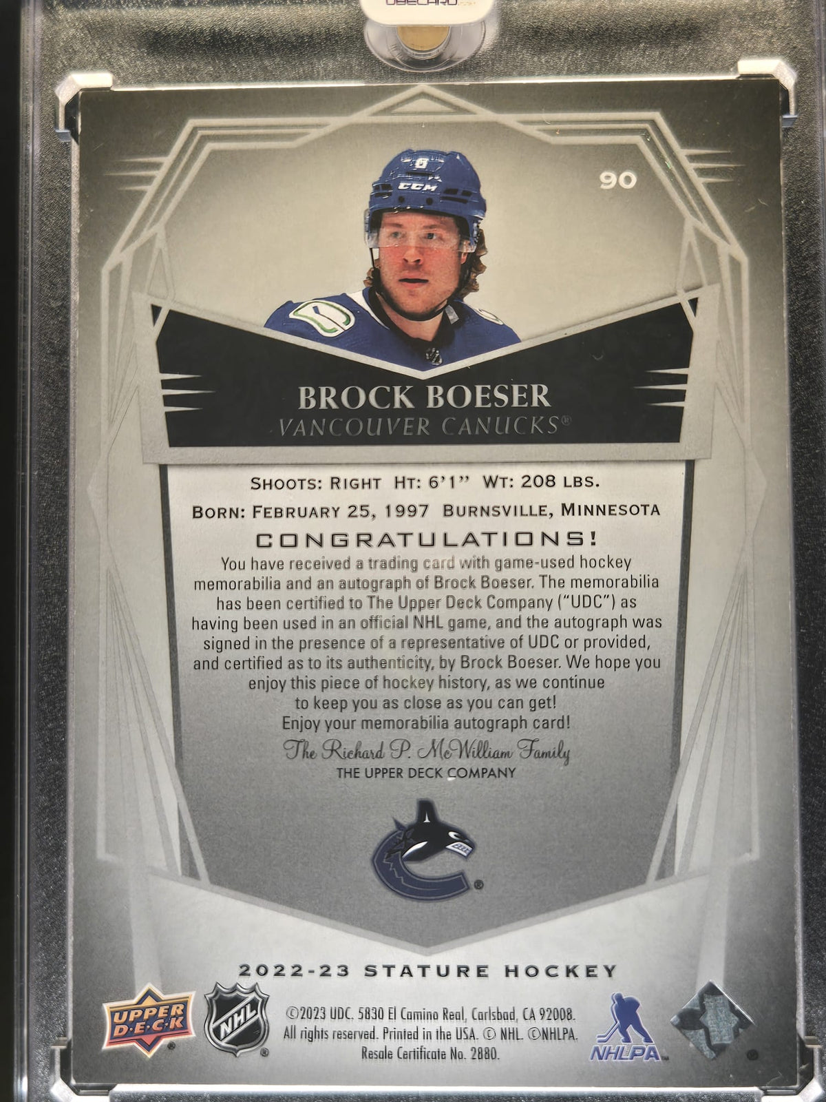 2022-23 UD Stature Brock Boeser /10 Patch Autograph No. 90