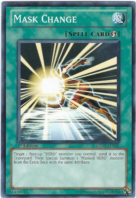 Target 1 face-up "Hero" monster you control, send it to the Graveyard. Then Special Summon 1 "Masked Hero" monster from the Extra Deck with the same Attribute.