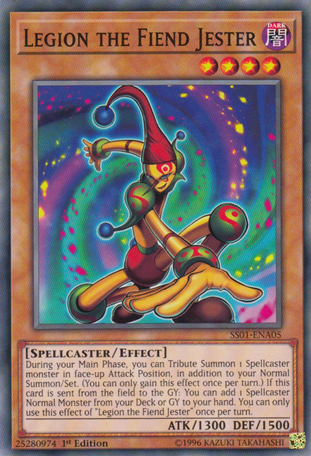 During your Main Phase, you can Tribute Summon 1 Spellcaster-Type monster in face-up Attack Position, in addition to your Normal Summon/Set. (You can only gain this effect once per turn.) If this card is sent from the field to the Graveyard: You can add 1 Spellcaster-Type Normal Monster from your Deck or GY to your hand. You can only use this effect of "Legion the Fiend Jester" once per turn.
