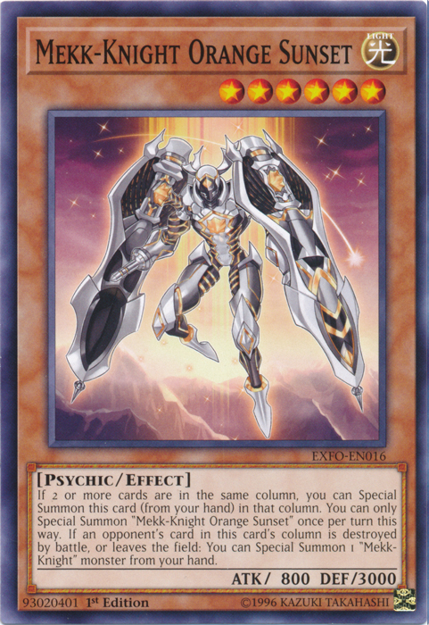 If 2 or more cards are in the same column, you can Special Summon this card (from your hand) in that column. You can only Special Summon "Mekk-Knight Orange Sunset" once per turn this way. If an opponent's card in this card's column is destroyed by battle, or leaves the field: You can Special Summon 1 "Mekk-Knight" monster from your hand.