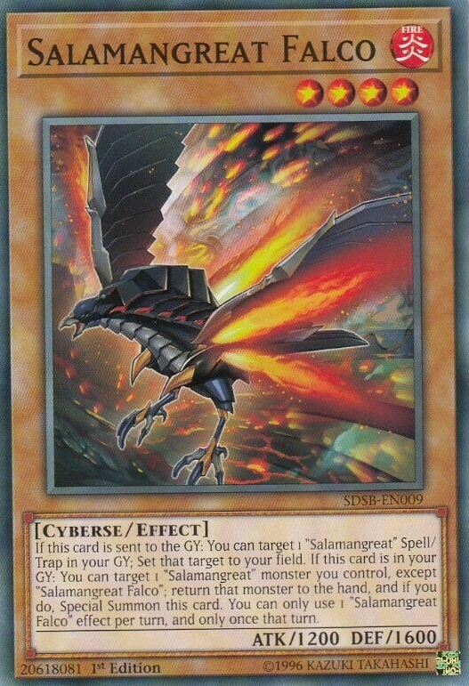 If this card is sent to the GY: You can target 1 "Salamangreat" Spell/Trap in your GY; Set that target to your field. If this card is in your GY: You can target 1 "Salamangreat" monster you control, except "Salamangreat Falco"; return that monster to the hand, and if you do, Special Summon this card. You can only use 1 "Salamangreat Falco" effect per turn, and only once that turn.