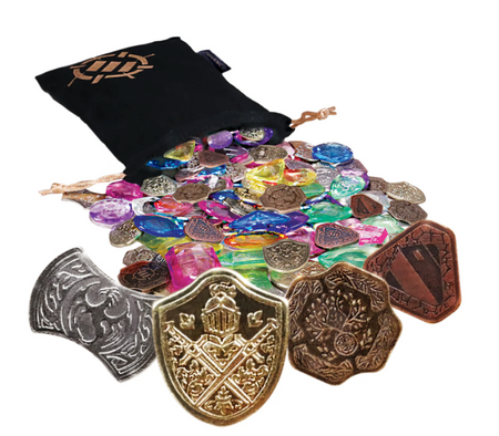- SET INCLUDES: Treasure token set includes 10 of each metal token design: Castle/Fortress, Tree/Nature, Shield/Knight, and Dragon designs | Also included are 40+ gems of assorted shapes and colors
