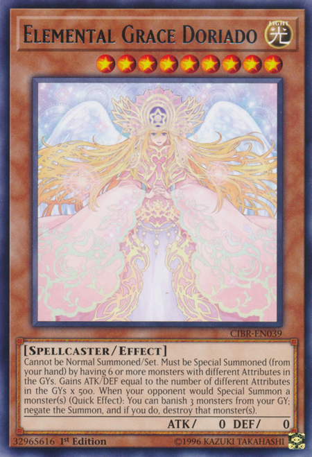 Cannot be Normal Summoned/Set. Must be Special Summoned (from your hand) by having 6 or more monsters with different Attributes in the GYs. Gains ATK/DEF equal to the number of different Attributes in the GYs x 500. When your opponent would Special Summon a monster(s) (Quick Effect): You can banish 3 monsters from your GY; negate the Summon, and if you do, destroy that monster(s).