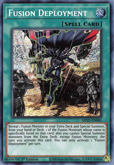 Reveal 1 Fusion Monster in your Extra Deck and Special Summon, from your hand or Deck, 1 of the Fusion Materials whose name is specifically listed on that card, also you cannot Special Summon monsters from the Extra Deck, except Fusion Monsters, the turn you activate this card. You can only activate 1 "Fusion Deployment" per turn.