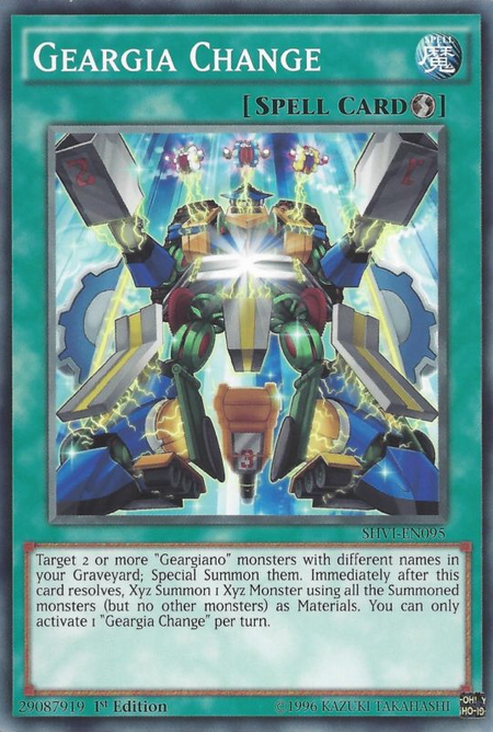Target 2 or more "Geargiano" monsters with different names in your Graveyard; Special Summon them. Immediately after this card resolves, Xyz Summon 1 Xyz Monster using all the Summoned monsters (but no other monsters) as Materials. You can only activate 1 "Geargia Change" per turn.