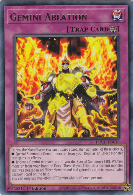 • Tribute 1 Gemini monster, and if you do, Special Summon 1 FIRE Warrior monster from your hand or Deck. Then, if you Tributed a Gemini monster that was treated as an Effect Monster and had gained its effects, you can also destroy 1 card on the field.