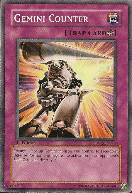 Change 1 face-up Gemini Monster you control to face-down Defense Position and negate the activation of an opponent's Spell Card and destroy it.