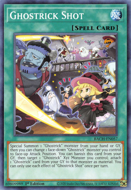 Special Summon 1 "Ghostrick" monster from your hand or GY, then you can change 1 face-down "Ghostrick" monster you control to face-up Attack Position. You can banish this card from your GY, then target 1 "Ghostrick" Xyz Monster you control; attach 1 "Ghostrick" card from your GY to that monster as material. You can only use each effect of "Ghostrick Shot" once per turn.