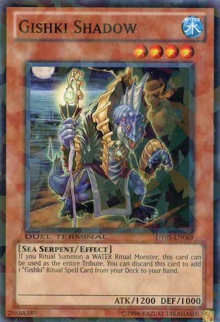If you Ritual Summon a WATER Ritual Monster, this card can be used as the entire Tribute. You can discard this card to add 1 "Gishki" Ritual Spell Card from your Deck to your hand.