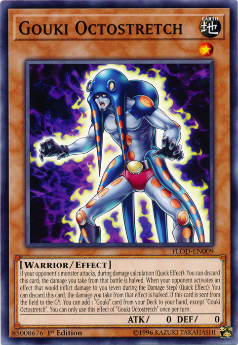 If your opponent's monster attacks, during damage calculation (Quick Effect): You can discard this card; the damage you take from that battle is halved. When your opponent activates an effect that would inflict damage to you (even during the Damage Step) (Quick Effect): You can discard this card; the damage you take from that effect is halved. If this card is sent from the field to the GY: You can add 1 "Gouki" card from your Deck to your hand, except "Gouki Octostretch". You can only use this effect of "Gouki Octostretch" once per turn.