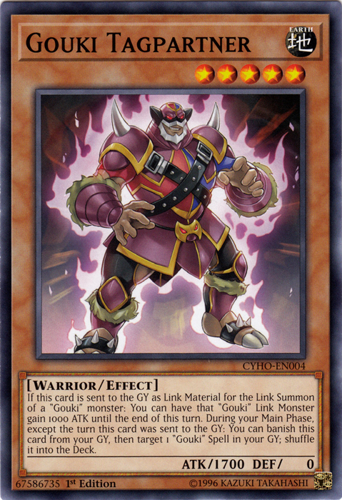 If this card is sent to the GY as Link Material for the Link Summon of a "Gouki" monster: You can have that "Gouki" Link Monster gain 1000 ATK until the end of this turn. During your Main Phase, except the turn this card was sent to the GY: You can banish this card from your GY, then target 1 "Gouki" Spell in your GY; shuffle it into the Deck.