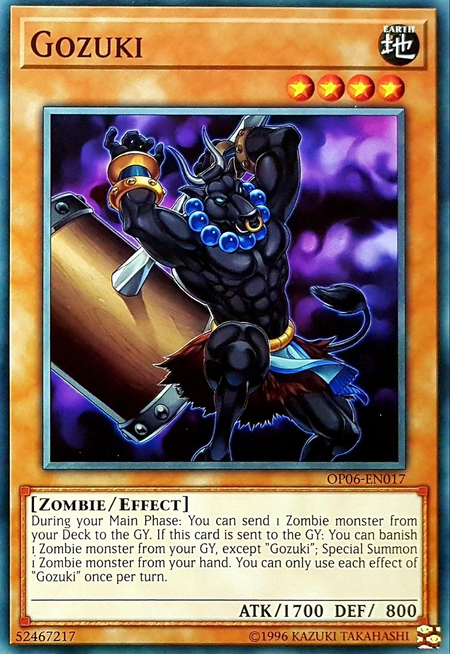 During your Main Phase: You can send 1 Zombie monster from your Deck to the GY. If this card is sent to the GY: You can banish 1 Zombie monster from your GY, except "Gozuki"; Special Summon 1 Zombie monster from your hand. You can only use each effect of "Gozuki" once per turn.