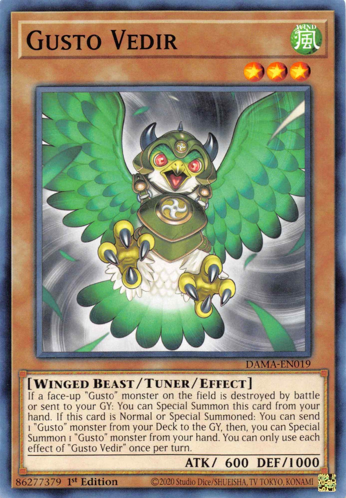 If a face-up "Gusto" monster on the field is destroyed by battle or sent to your GY: You can Special Summon this card from your hand. If this card is Normal or Special Summoned: You can send 1 "Gusto" monster from your Deck to the GY, then, you can Special Summon 1 "Gusto" monster from your hand. You can only use each effect of "Gusto Vedir" once per turn.