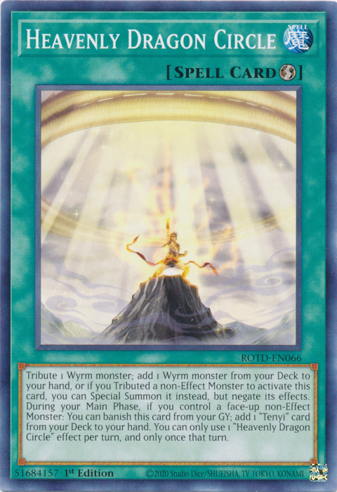 Tribute 1 Wyrm monster; add 1 Wyrm monster from your Deck to your hand, or if you Tributed a non-Effect Monster to activate this card, you can Special Summon it instead, but negate its effects. During your Main Phase, if you control a face-up non-Effect Monster: You can banish this card from your GY; add 1 "Tenyi" card from your Deck to your hand. You can only use 1 "Heavenly Dragon Circle" effect per turn, and only once that turn.