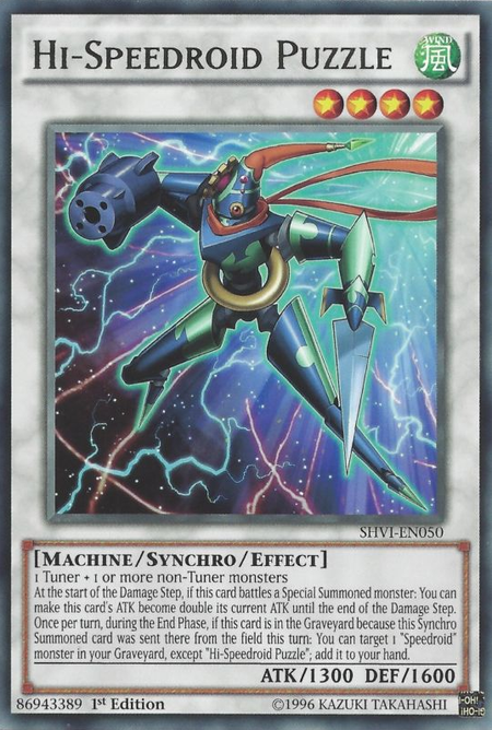 At the start of the Damage Step, when this card battles a Special Summoned monster: You can make this card's ATK become double its current ATK until the end of the Damage Step. Once per turn, during the End Phase, if this card is in the Graveyard because this Synchro Summoned card was sent there from the field this turn: You can target 1 "Speedroid" monster in your Graveyard, except "Hi-Speedroid Puzzle"; add it to your hand.
