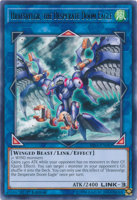 Gains 2400 ATK while your opponent has no monsters in their GY. (Quick Effect): You can target 1 monster in your opponent's GY; shuffle it into the Deck. You can only use this effect of "Hraesvelgr, the Desperate Doom Eagle" once per turn.