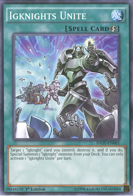 Target 1 "Igknight" card you control; destroy it, and if you do, Special Summon 1 "Igknight" monster from your Deck. You can only activate 1 "Igknights Unite" per turn.
