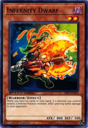 While you have no cards in your hand, if a monster you control attacks a Defense Position monster, inflict piercing battle damage to your opponent.