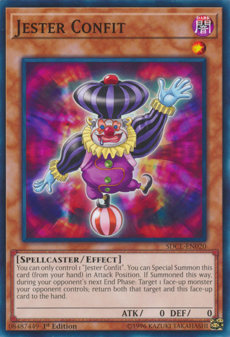 You can only control 1 "Jester Confit". You can Special Summon this card (from your hand) in Attack Position. If Summoned this way, during your opponent's next End Phase: Target 1 face-up monster your opponent controls; return both that target and this face-up card to the hand.